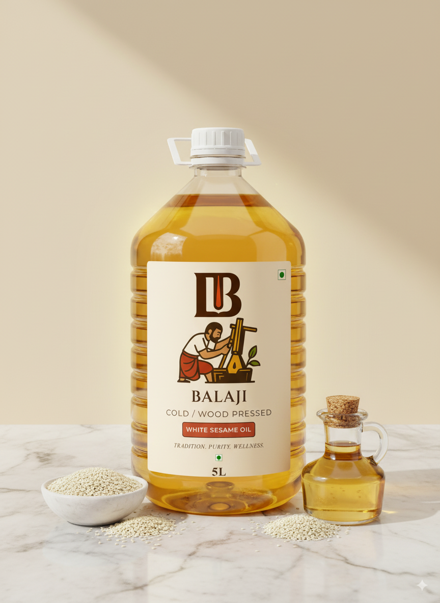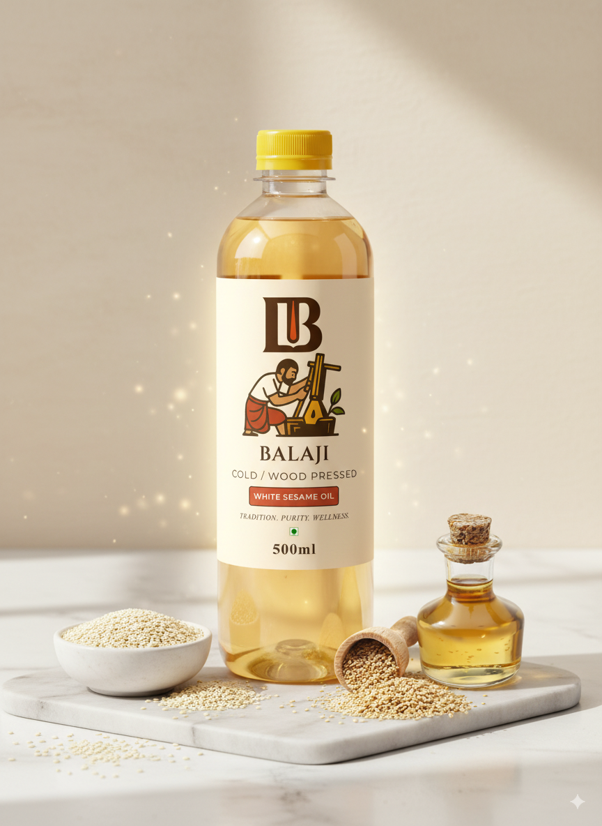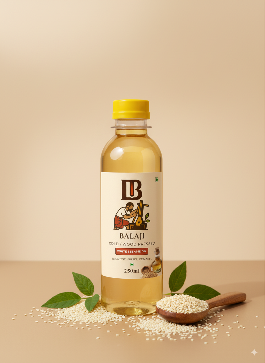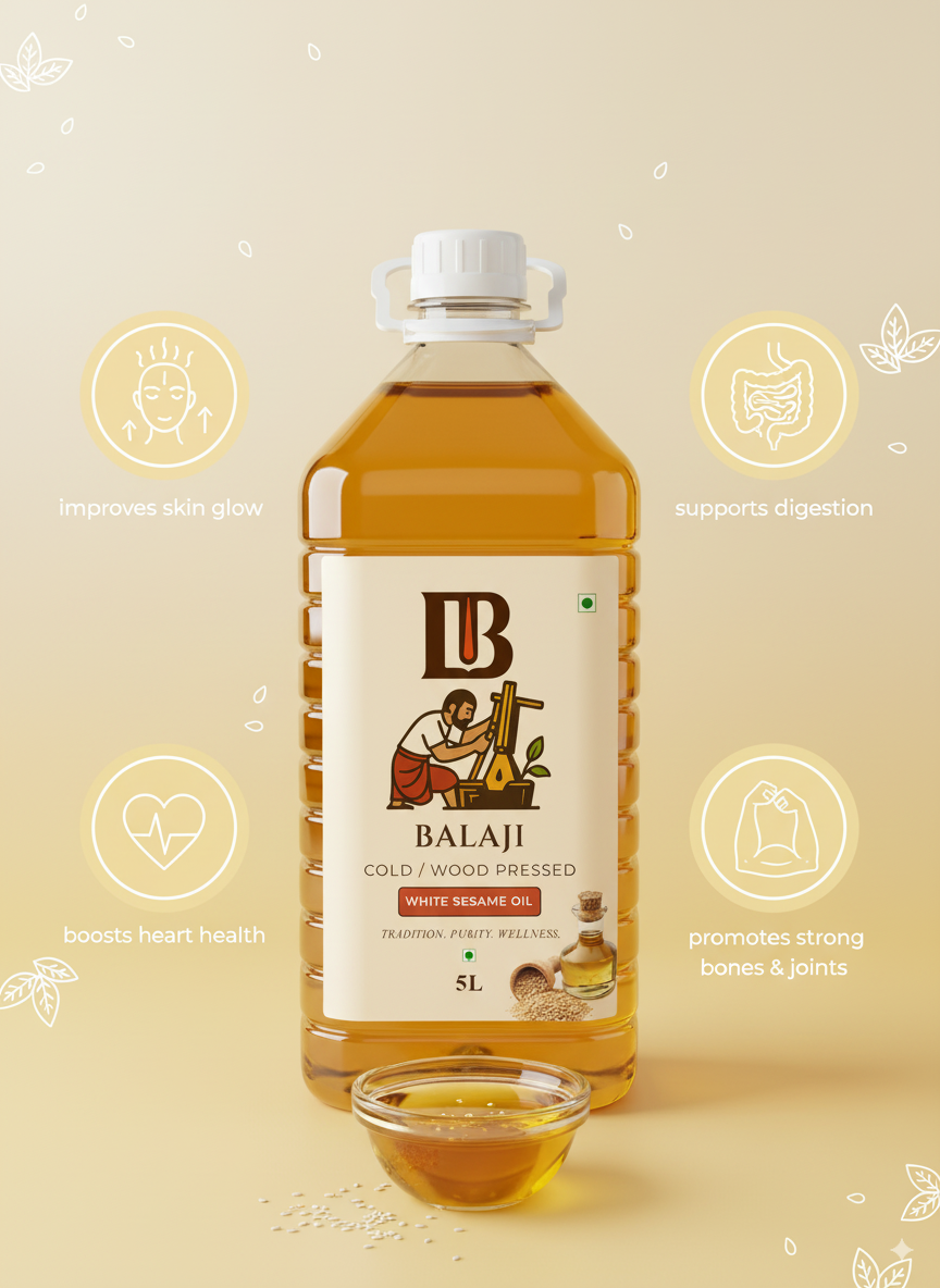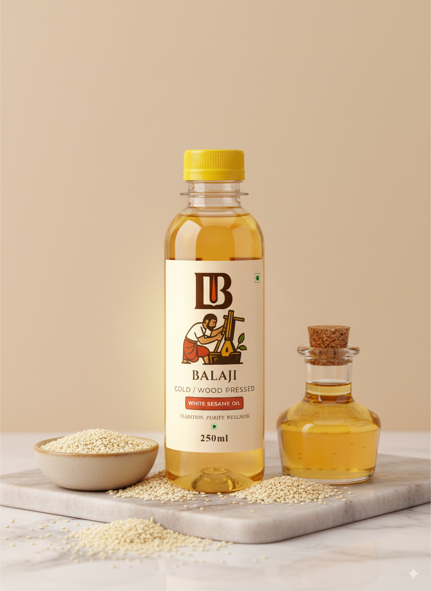 Premium quality white sesame oil extracted through cold pressing method, retaining all natural nutrients and the distinctive nutty flavor of sesame seeds.