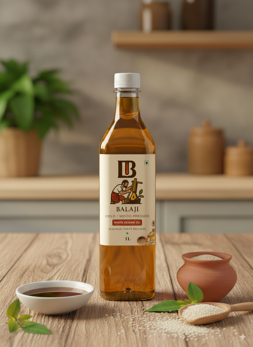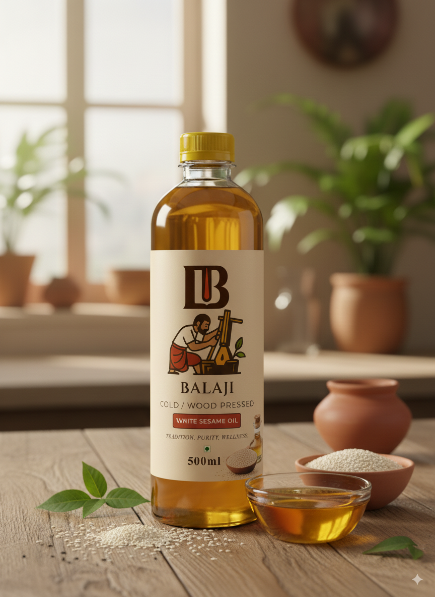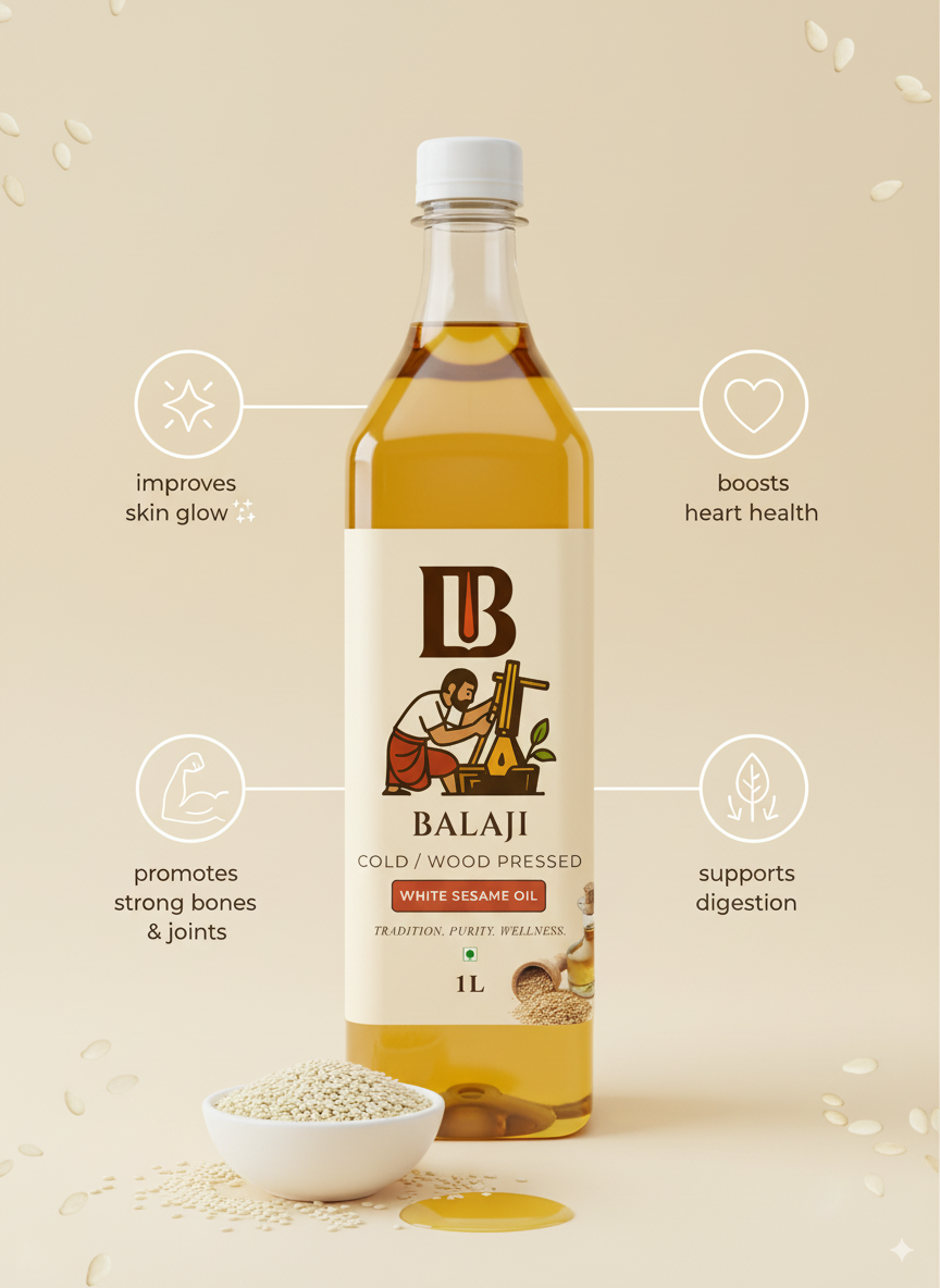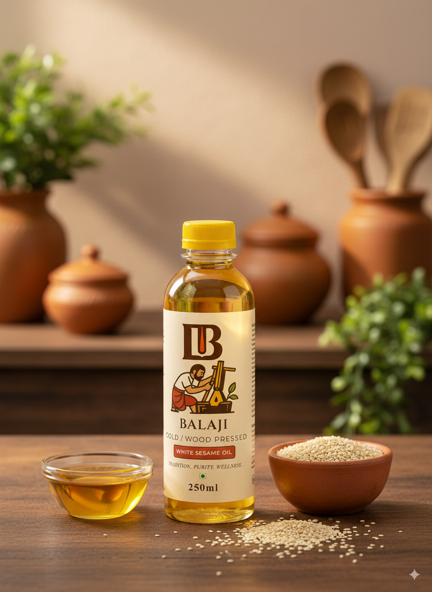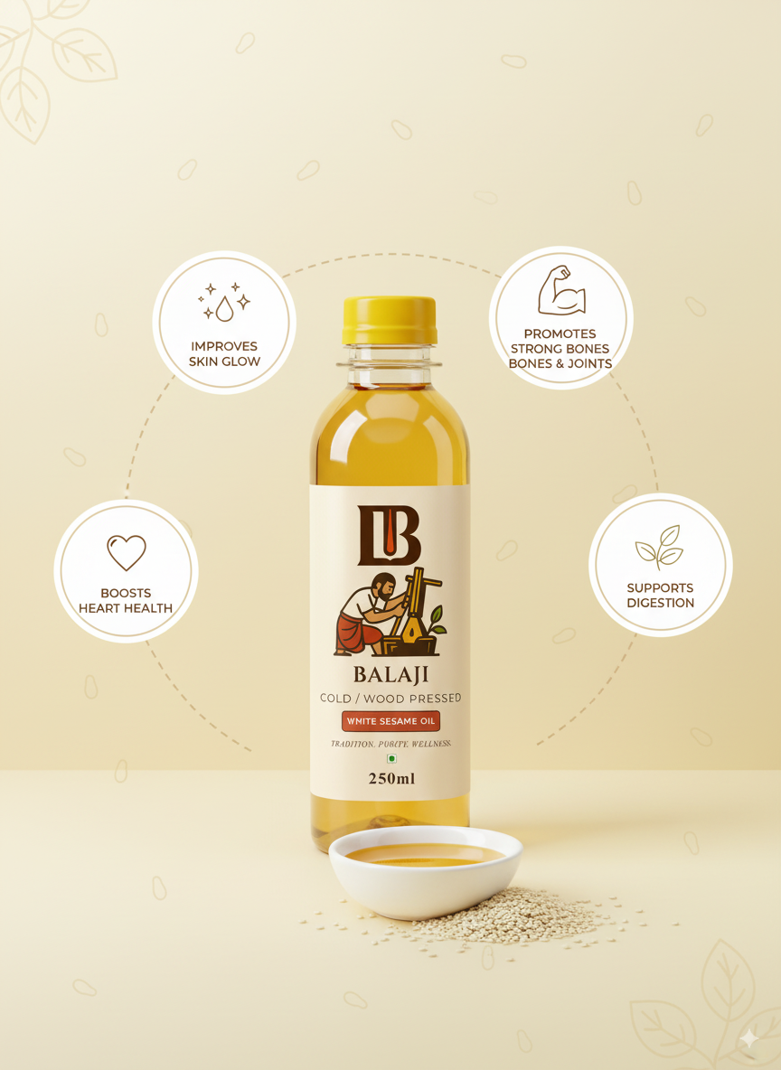 Premium quality white sesame oil extracted through cold pressing method, retaining all natural nutrients and the distinctive nutty flavor of sesame seeds.